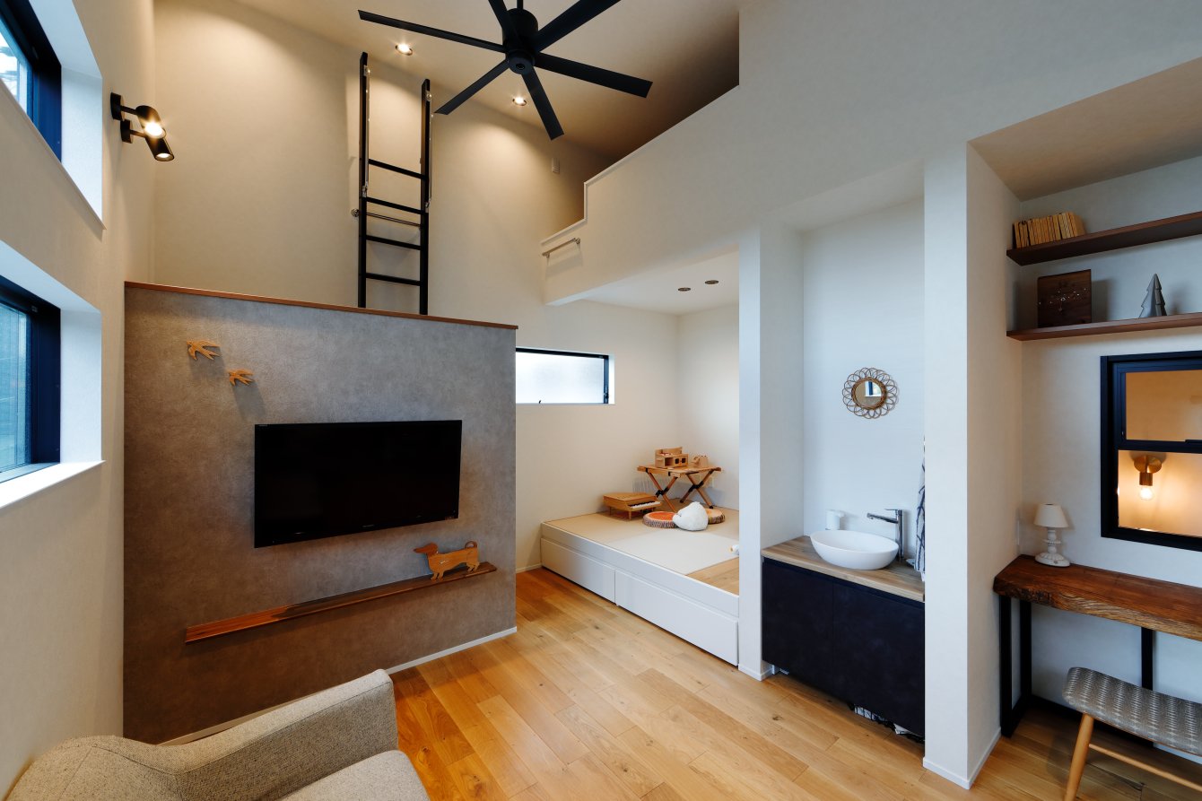 落ち着きある雰囲気に。ロフトのあるリビングは、
