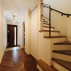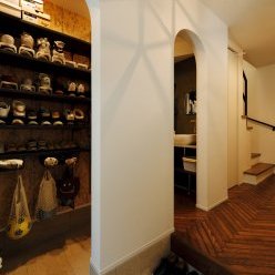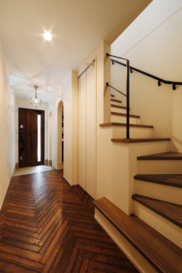 生まれ育ったエリアでの家づくりは長年の夢だったそう。奥様と幼馴染というご縁から、このたび、お問合せをいただきました。長屋を切り離しての新築工事で、敷地面積こそコンパクトですが室内は広々。玄関ドアを開けると職人さんが丁寧に手仕事で仕上げたヘリンボーン張りの床面がまっすぐに続きます。勾配天井の吹き抜けが広がる2階リビングは、住宅密集地であることを忘れそうな開放感。小上がりの和室には堀込み式のデスクを造作し、工作をしたり、絵本を読んだり。もちろん、のんびりとお昼寝も。「デザインと暮らし心地、どちらも兼ね備えた家を」。そんなNさんの想いが詰まったお住まいです。