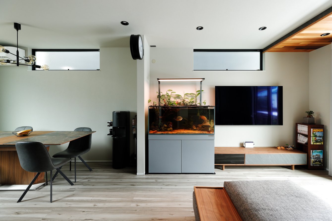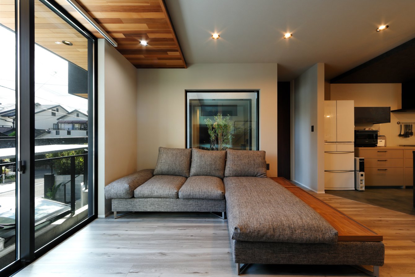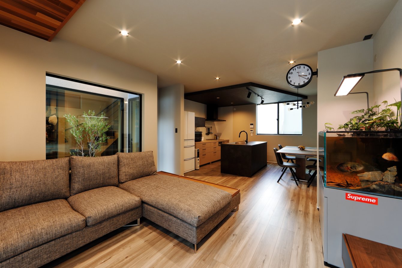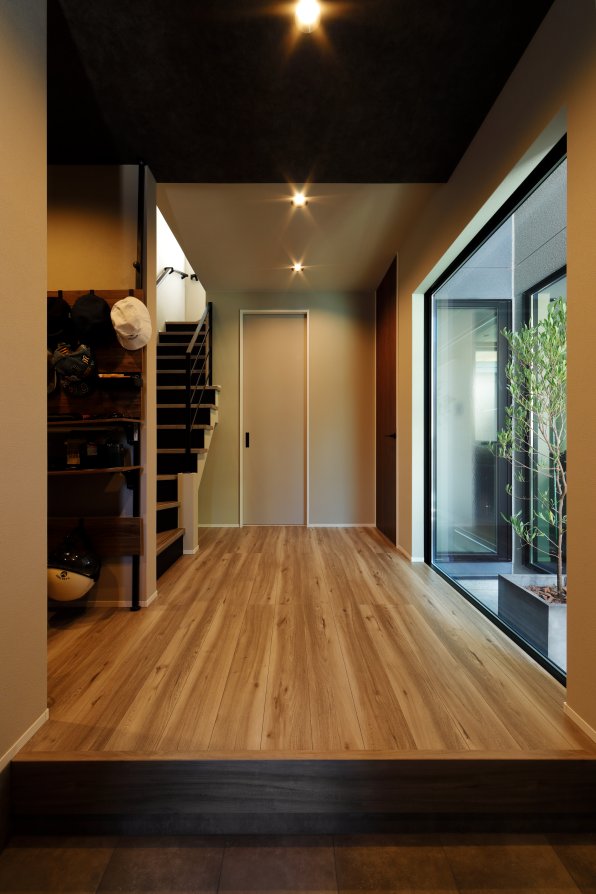 図形を重ねたようなシャープなフォルムとツートンカラーが目を惹くK様のお住まい。中央に配したスリット状の中庭が奥行を感じさせ、重厚感のある外観デザインに仕上がりました。室内に目を向けると、アウトドアが大好きなご夫婦のこだわりが随所に。広々としたエントランスホールにはたっぷりの土間収納を備え、中庭を挟むように配した2枚のフィックス窓が、LDKとエントランスを視覚的につないでいます。外からの開口を絞りつつ、室内は圧倒的な開放感。のびやかに趣味を楽しむお住まいになりました。