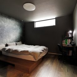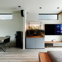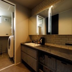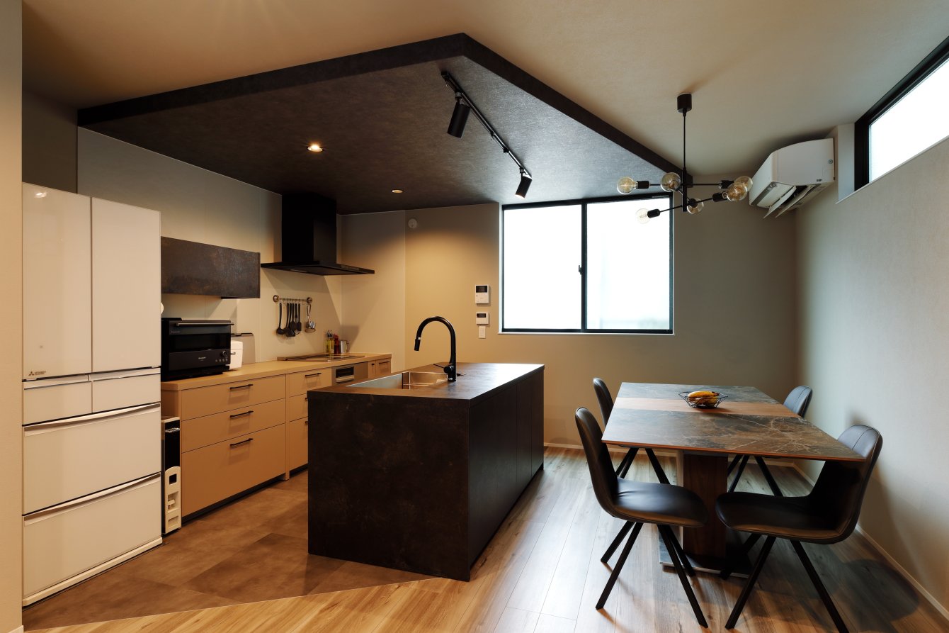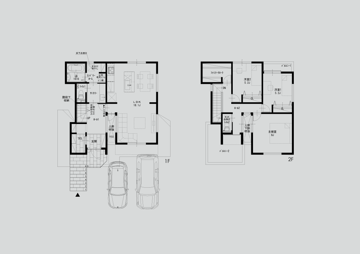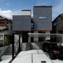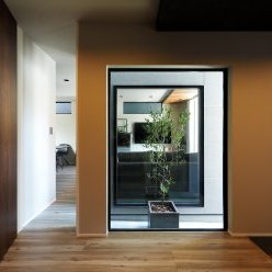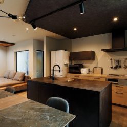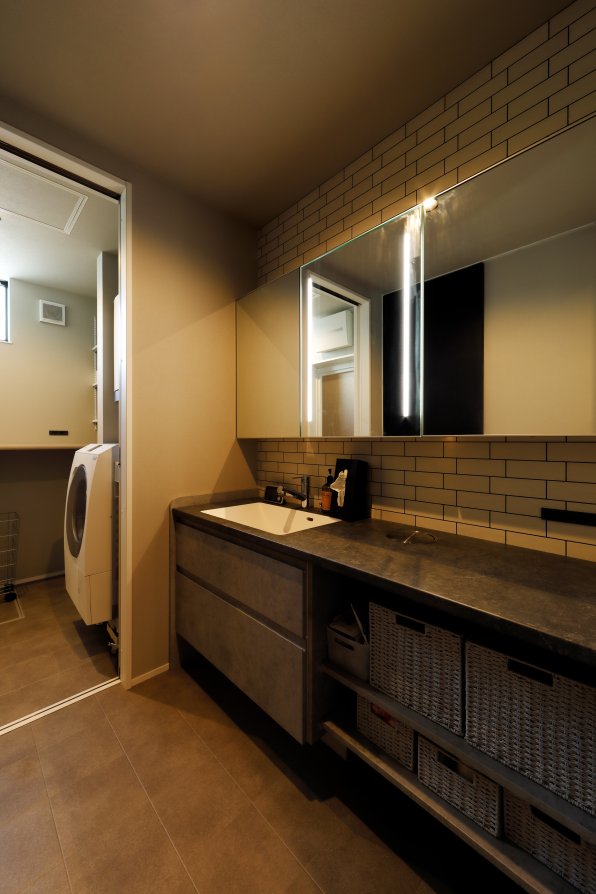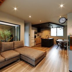 図形を重ねたようなシャープなフォルムとツートンカラーが目を惹くK様のお住まい。中央に配したスリット状の中庭が奥行を感じさせ、重厚感のある外観デザインに仕上がりました。室内に目を向けると、アウトドアが大好きなご夫婦のこだわりが随所に。広々としたエントランスホールにはたっぷりの土間収納を備え、中庭を挟むように配した2枚のフィックス窓が、LDKとエントランスを視覚的につないでいます。外からの開口を絞りつつ、室内は圧倒的な開放感。のびやかに趣味を楽しむお住まいになりました。
