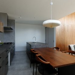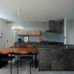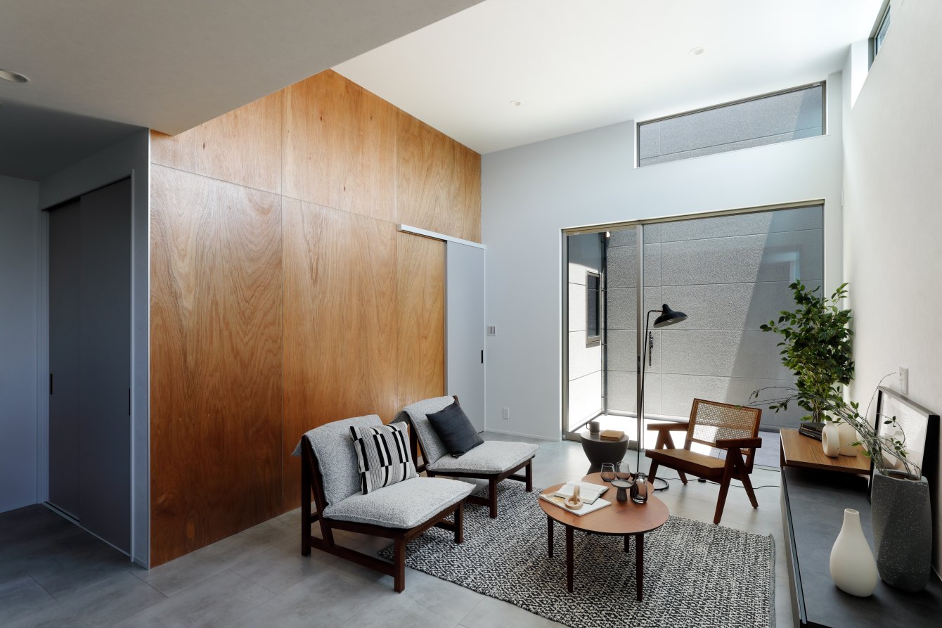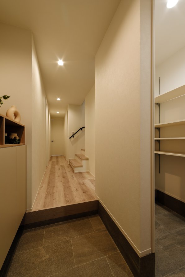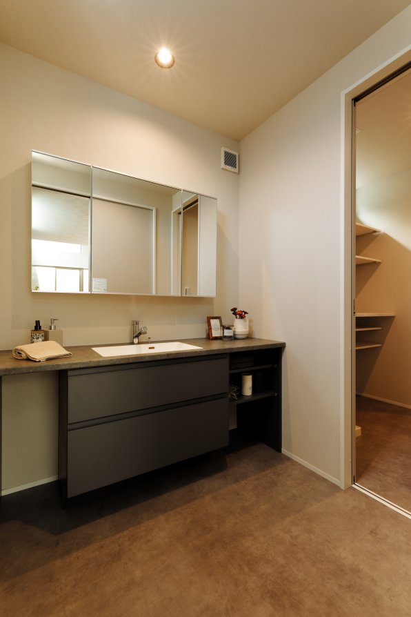 注文住宅をご検討されている方から、たくさんご希望を頂く人気の間取りを1棟に凝縮。ワンフロア完結の家事動線はもちろん、ただいま手洗いに、大容量のファミリークローク、洗練した空間づくりが出来ることで人気のグラフテクトのデュエ型キッチンなど...。間取りにこだわって家づくりをしたい方、必見のモデルハウスが完成しました。リビングのフロアはタイル調フローリングを採用し、一棟貸しヴィラのような空間コーディネートに。ハーフ吹き抜け壁面のラワン合板がアクセントとなり空間を引き締めます。その他にもこだわりポイント満載です。