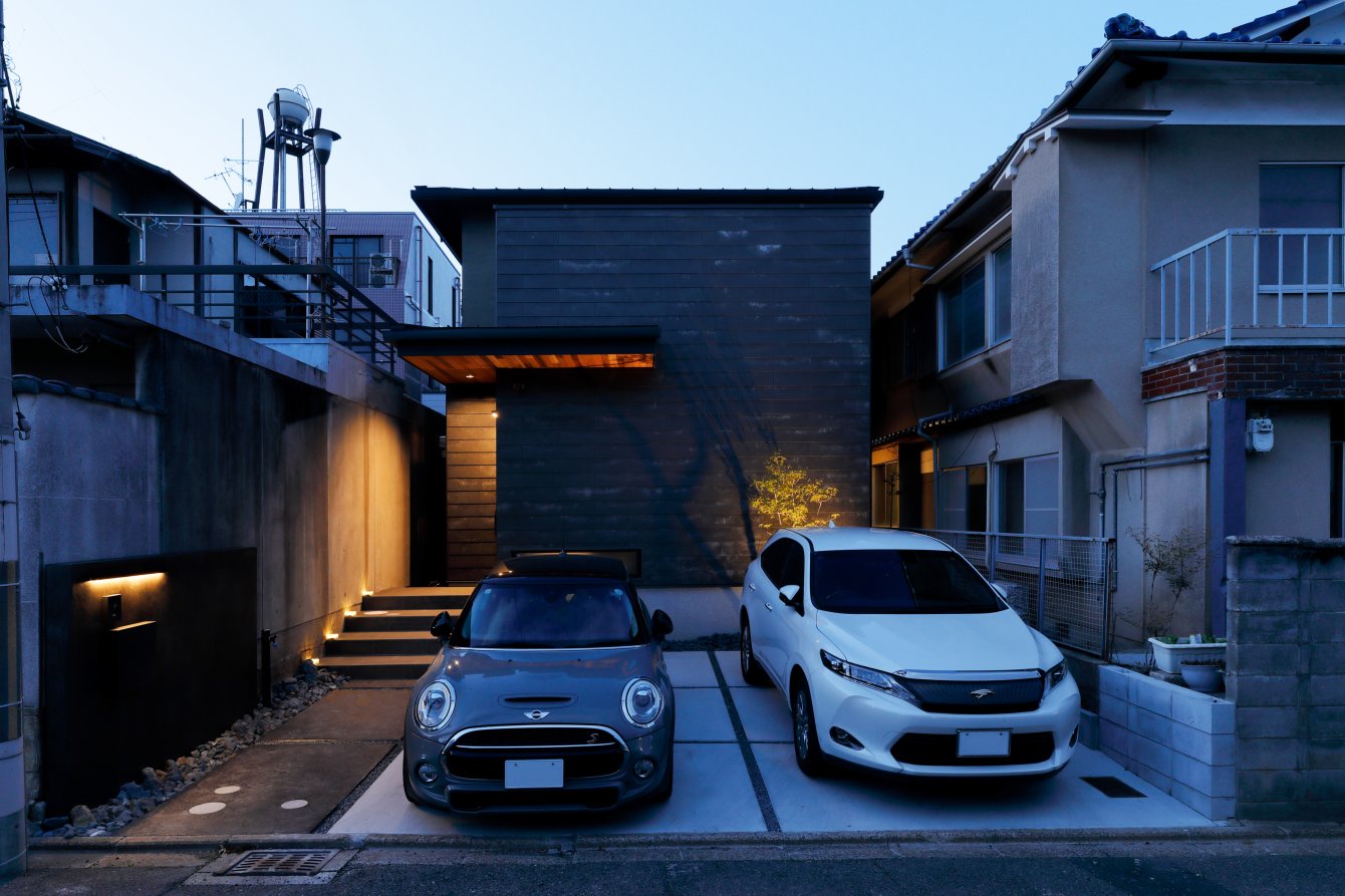 キューブを重ねたようなフォルムがスタイリッシュな印象を放つO様の新居。セメントの質感を活かした無垢素材の鎧張りがひときわ目を惹く外観です。前面道路から見ると開口部は見当たりませんが、室内は自然光が降り注ぐ明るい空間に。バルコニーの壁を高くすることでプライバシーを確保し、スクエアなデザインを実現しました。街並みに馴染ませながら、落ち着きの中にも個性が光るデザインを。O様ご夫妻と何度も打合せを重ね、叶えたお住まいです。