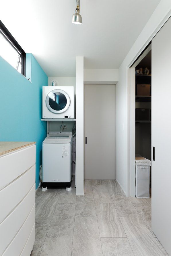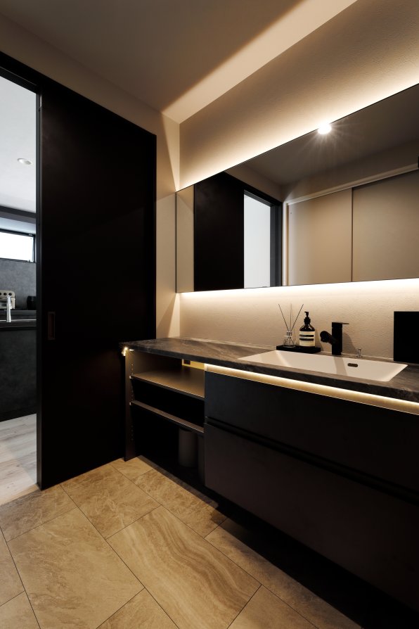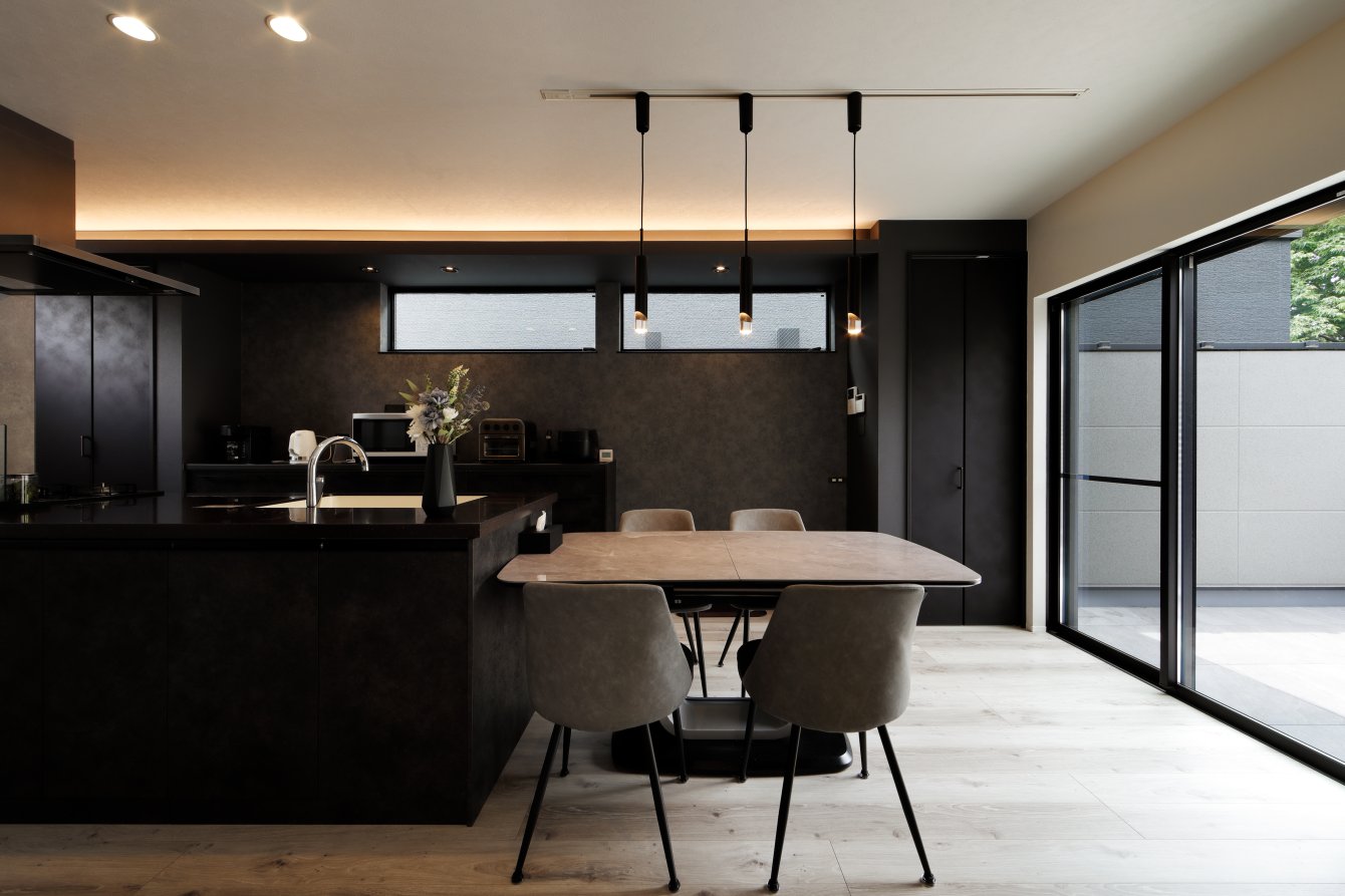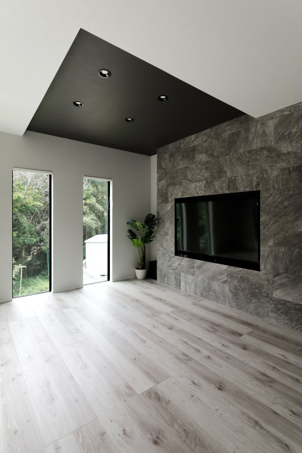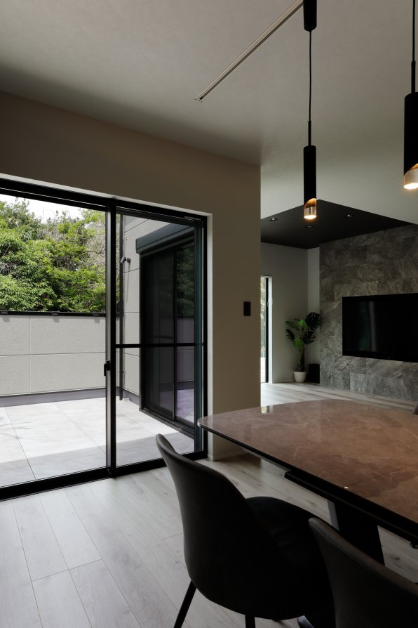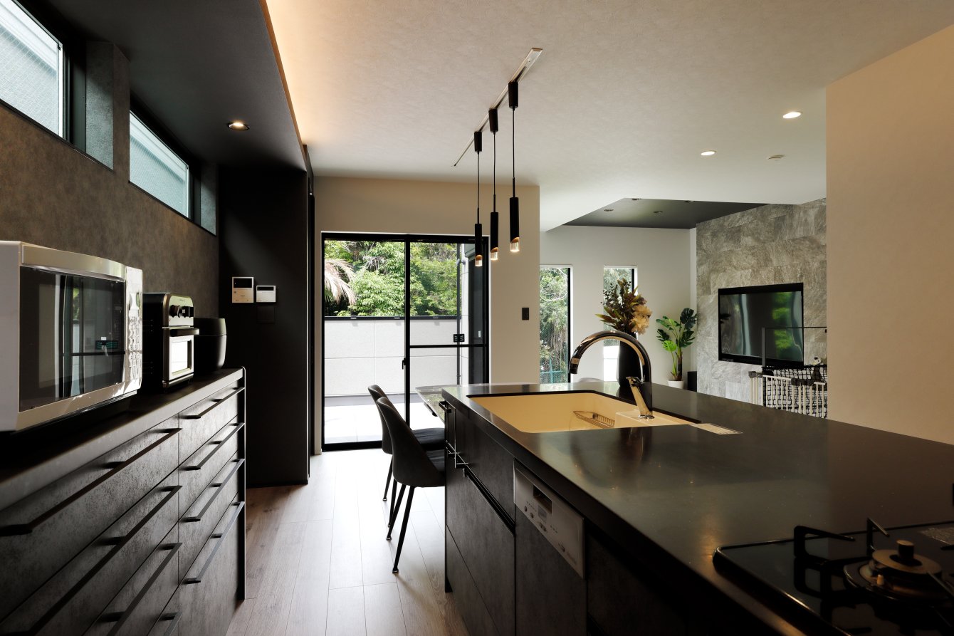 1階は車1台とバイク2台を格納できるゆとりあるガレージで、2階はフロア全体を活かした伸びやかなLDK。背後に雑木林が広がる敷地を活かし、リビングの大窓からは緑の風景が広がります。人工物がなく、木々だけが見える眺望は非日常のリラックス空間。F様がご夫婦で訪れたリゾート地のホテルをイメージし、細部までこだわって叶えられました。もちろん、暮らしやすさにも妥協なし。回遊できるキッチンや一か所に集約した洗濯動線、適所の収納など、家事をアシストする仕掛けが随所に込められています。毎日をもっと楽しく快適に。F様の想いが詰まったご新居です。