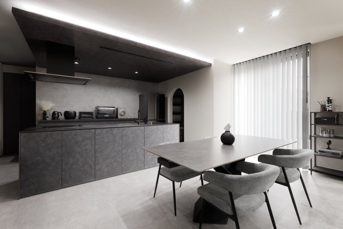 スクエアと片流れの屋根を組み合わせた独特のフォルム。見る角度によって表情を変え、街並みの中でひときわ個性を放つT様のお住まい。趣味の車を複数台駐車できる広い敷地に、ゆったりと佇んでいます。内観はモノトーンでまとめたモダンデザイン。エントランスをくぐると左官仕上げのアクセントウォールが現れ、リビングのTV背面までひと続き。大胆なこてむらは手仕事ならでは味わいです。間接照明が壁面の凹凸を引き立て、一層の存在感。キッチンからダイニング、リビングへと視界が広がる開放感の中、愛猫たちとのびやかに暮らすT様ご夫妻です。