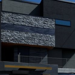 黒を基調とした落ち着いた外観デザイン。貼り分けられた石タイルがひときわ存在感を放つA様のご新居。広いLDKはマーブルのフロアで、壁面には外観と同じく石タイルを取り入れています。効果的に配した間接照明が石の凹凸を美しく照らし出し、日中とはまた違った印象。重厚な素材を用いながら、配色のバランスを取ることで重くなりすぎない空間を叶えています。「気が付けば、いつも家族が揃っている」とおっしゃるリビングはA様のお気に入り。広々としたリビングの向こうにはワンちゃんたちが遊ぶ芝生の庭が広がって、毎日を思う存分楽しむA様ご一家です。