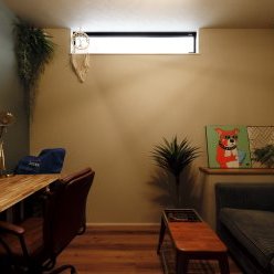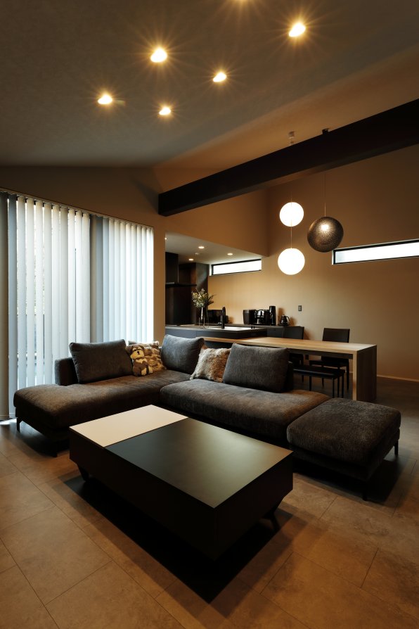 片流れ屋根の大らかなフォルムに、スリットのような図形が重なる外観デザイン。玄関ドアを開けると、モールテック塗りと木で造作された「絵になる階段」が現れます。踊り場の窓から差し込む光に包まれて2階へと進むと、勾配天井の大空間LDK。間接照明が引き立てるTV背面の塗り壁は、2面をアールで繋いで、より一層の広がりを生み出しています。またN様ご夫妻のご要望は、わんちゃんと暮らす家。リビング一角に設けた2匹の愛犬スペースは、地窓から外の景色を楽しめるこの家の一等地です。人も犬ものびのび暮らしつつ、生活感に埋もれないノイズレスなお住まいができました。
