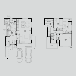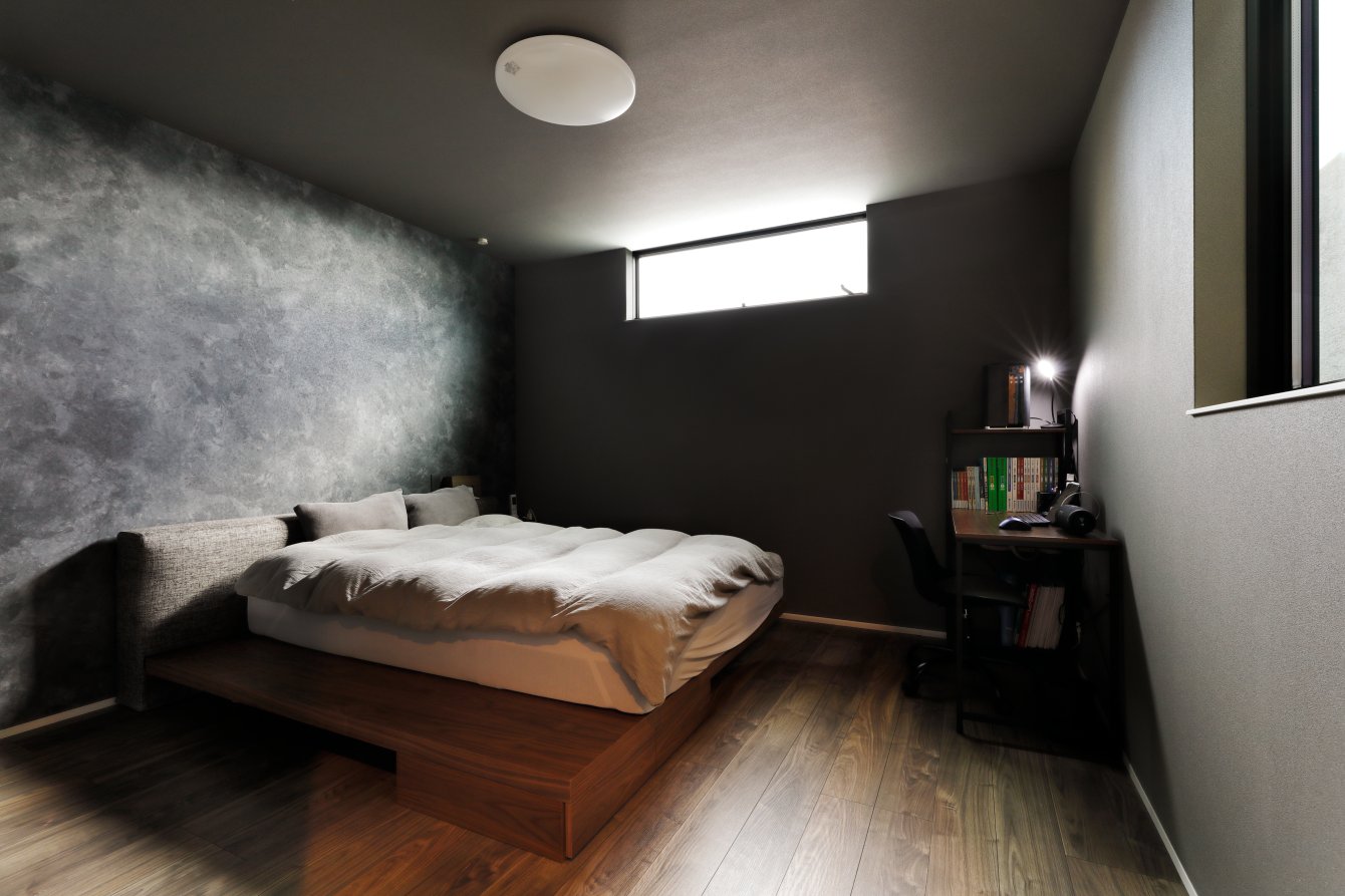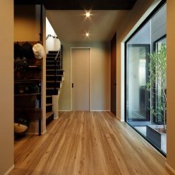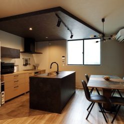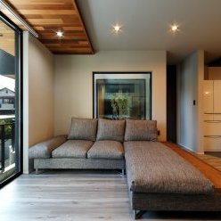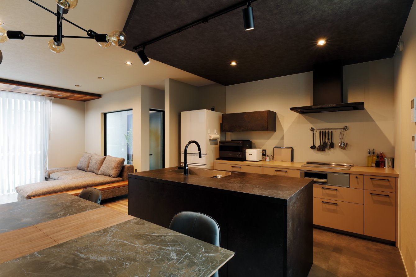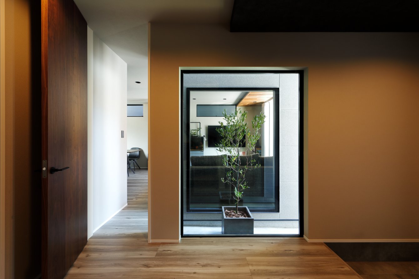 図形を重ねたようなシャープなフォルムとツートンカラーが目を惹くK様のお住まい。中央に配したスリット状の中庭が奥行を感じさせ、重厚感のある外観デザインに仕上がりました。室内に目を向けると、アウトドアが大好きなご夫婦のこだわりが随所に。広々としたエントランスホールにはたっぷりの土間収納を備え、中庭を挟むように配した2枚のフィックス窓が、LDKとエントランスを視覚的につないでいます。外からの開口を絞りつつ、室内は圧倒的な開放感。のびやかに趣味を楽しむお住まいになりました。