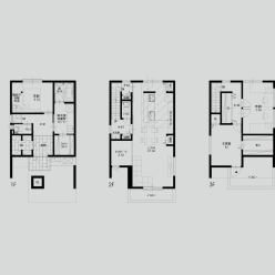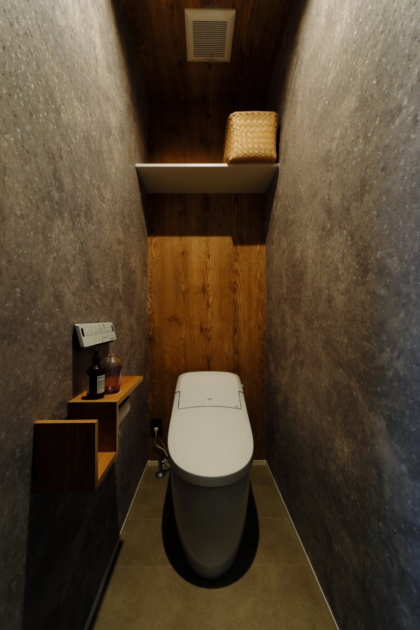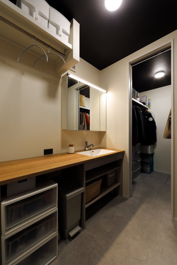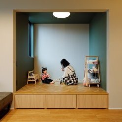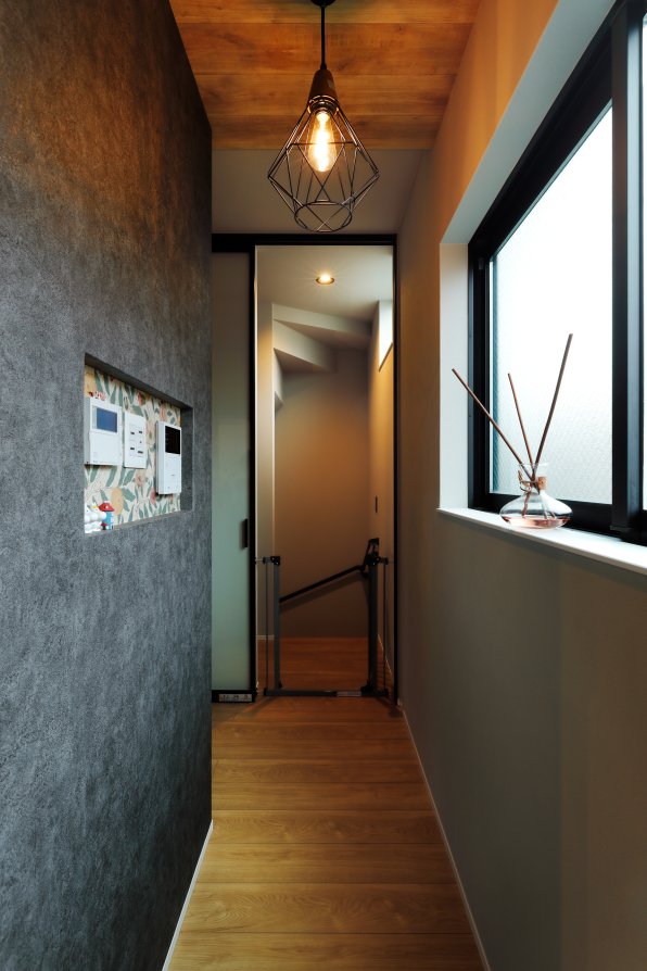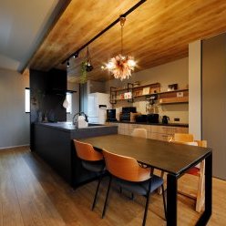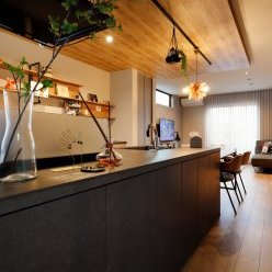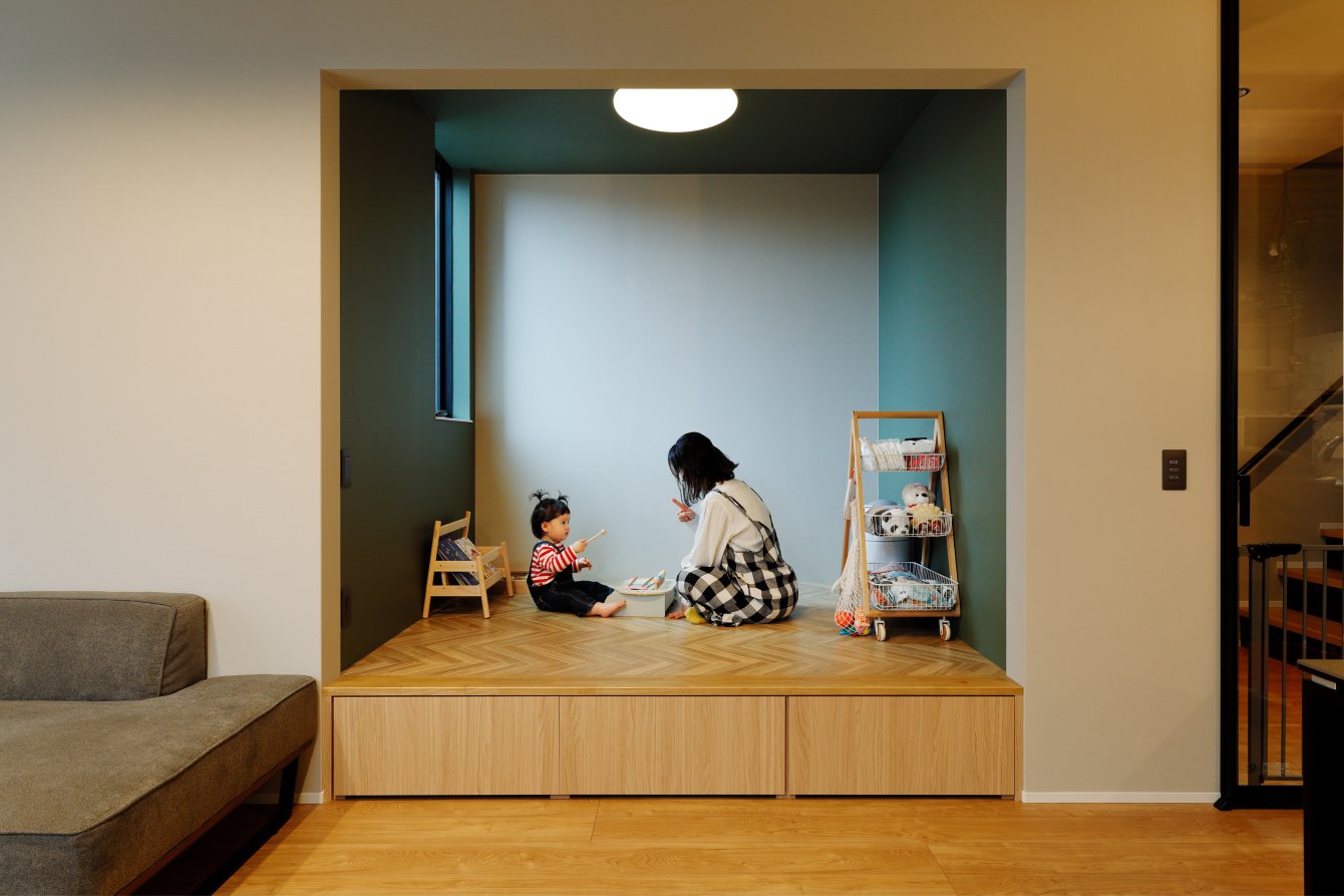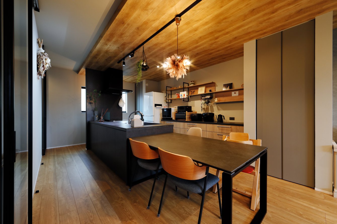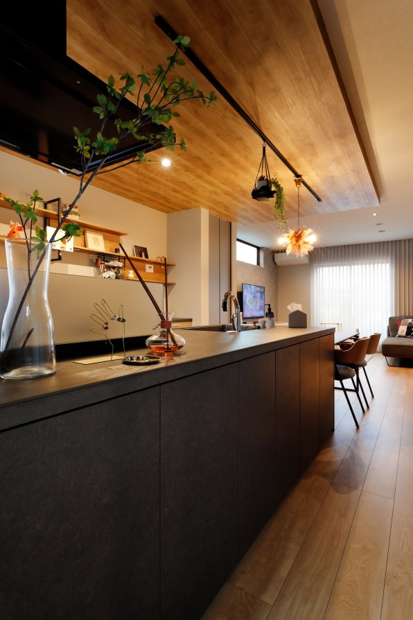 ナチュラルな外壁カラーと軒天の木目がやわらかく馴染むM様の住まい。コンパクトな敷地を最大限に活かすプランと、ひときわ目を惹くデザインが特長です。1階は水回りと大容量のクローゼット、トレーニングルームを配して機能的に。2階は小上がりヌックのあるLDKで、フロア全面をゆったりと使う広々とした空間を叶えています。外からの光を取り込む伸びやかなスペースは、家族みんなが集まるお気に入りの場所。やさしいアースカラーの配色と直線的なデザインを融合し、居心地よく、かっこよく。そんなお住まいが完成しました。