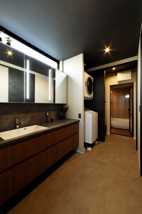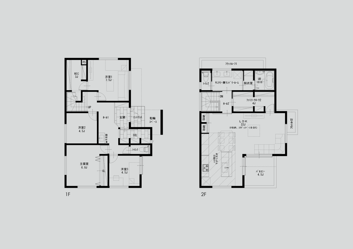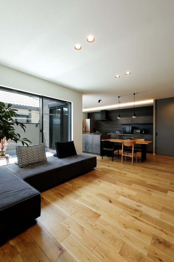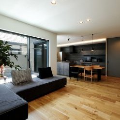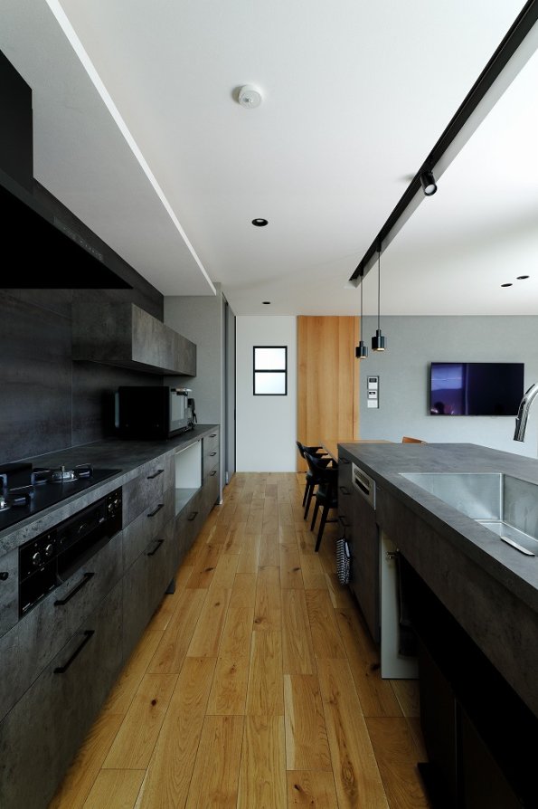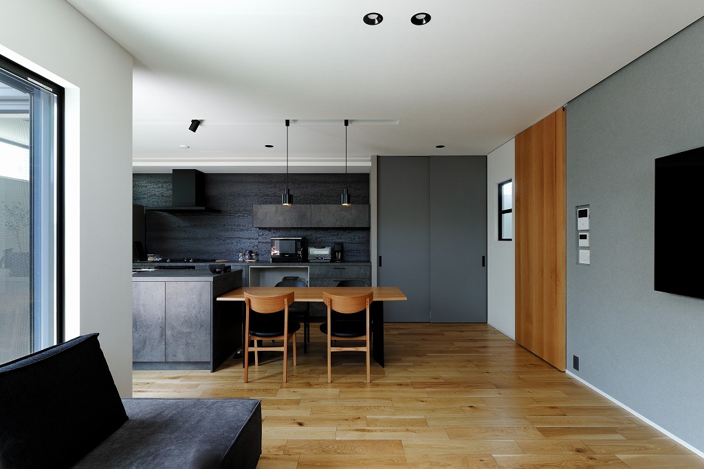 M様邸は明るく広々とした空間が魅力。2方向に面したバルコニーのある2階LDKで、自然光を存分に取り込んでいます。回遊できるアイランドキッチンを中心に、家族がくつろげる場所がいくつも。水回りを共有することで、より一層空間を広く使えるプランです。外観は異素材をミックスさせたスタイリッシュデザイン。トラバーチン仕上げの塗り壁が豊かな表情を見せ、ガルバリウム鋼板とSOLIDOの硬質感を引き立てます。外の視線を気にせず伸びやかに暮らす、仲良し二世帯のお住まいが完成しました。