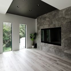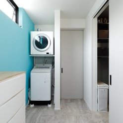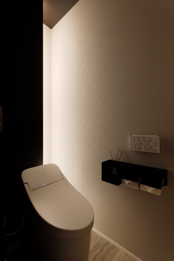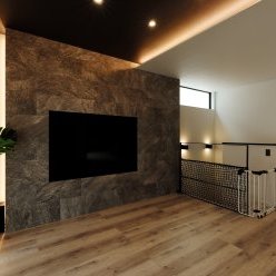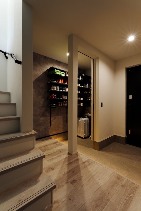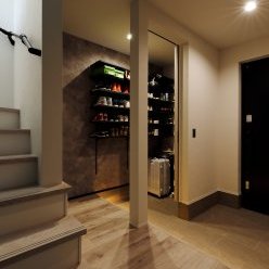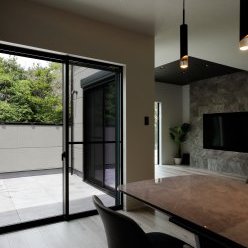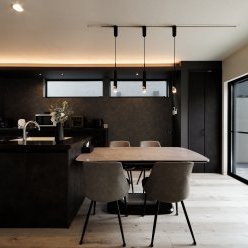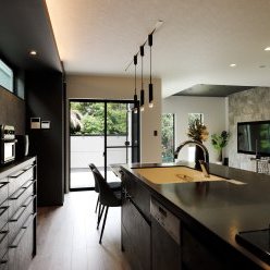 1階は車1台とバイク2台を格納できるゆとりあるガレージで、2階はフロア全体を活かした伸びやかなLDK。背後に雑木林が広がる敷地を活かし、リビングの大窓からは緑の風景が広がります。人工物がなく、木々だけが見える眺望は非日常のリラックス空間。F様がご夫婦で訪れたリゾート地のホテルをイメージし、細部までこだわって叶えられました。もちろん、暮らしやすさにも妥協なし。回遊できるキッチンや一か所に集約した洗濯動線、適所の収納など、家事をアシストする仕掛けが随所に込められています。毎日をもっと楽しく快適に。F様の想いが詰まったご新居です。