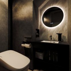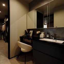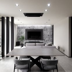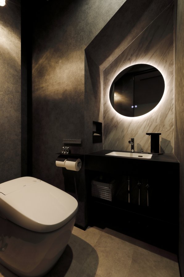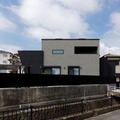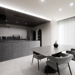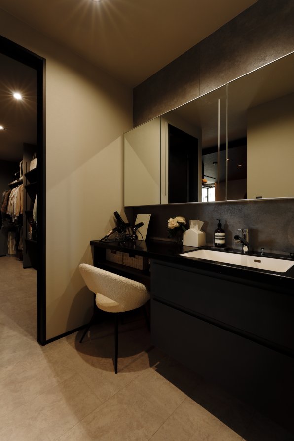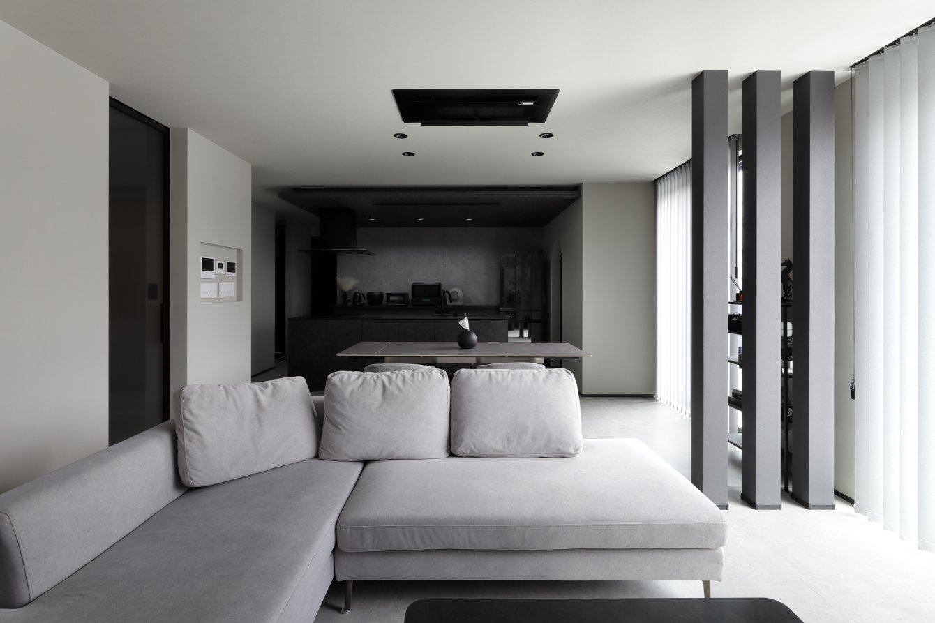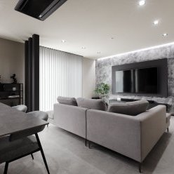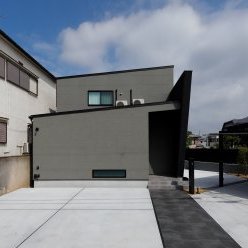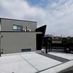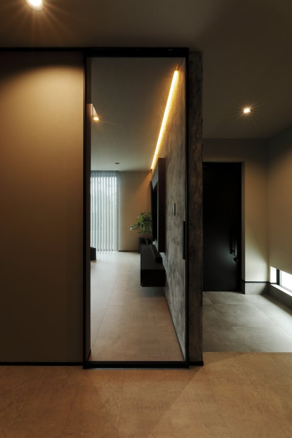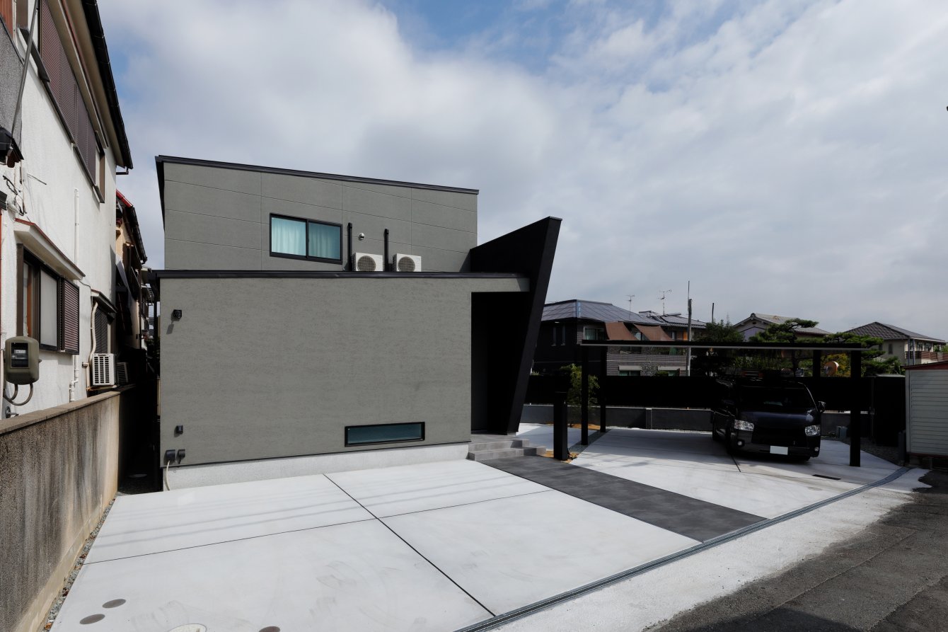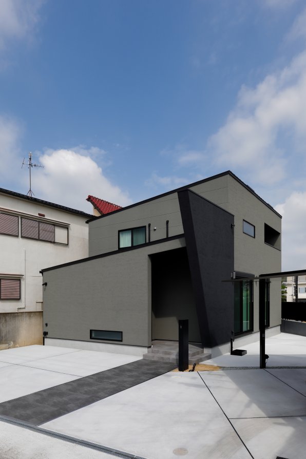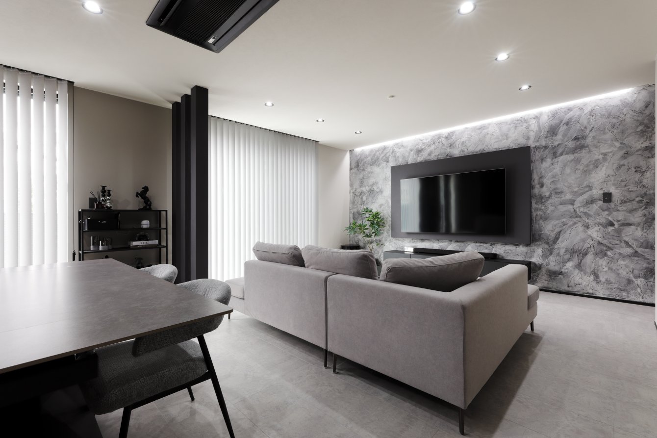 スクエアと片流れの屋根を組み合わせた独特のフォルム。見る角度によって表情を変え、街並みの中でひときわ個性を放つT様のお住まい。趣味の車を複数台駐車できる広い敷地に、ゆったりと佇んでいます。内観はモノトーンでまとめたモダンデザイン。エントランスをくぐると左官仕上げのアクセントウォールが現れ、リビングのTV背面までひと続き。大胆なこてむらは手仕事ならでは味わいです。間接照明が壁面の凹凸を引き立て、一層の存在感。キッチンからダイニング、リビングへと視界が広がる開放感の中、愛猫たちとのびやかに暮らすT様ご夫妻です。