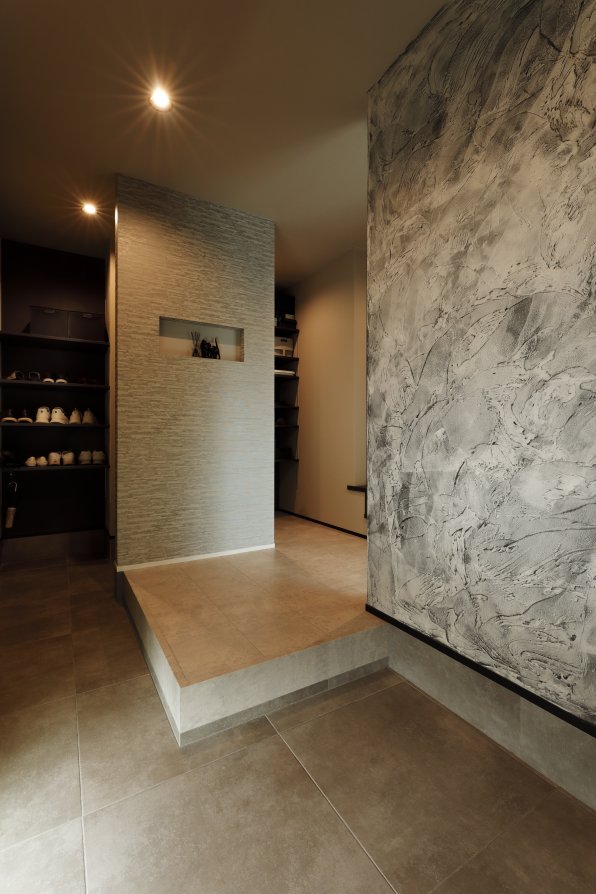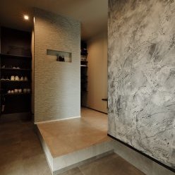 玄関からリビングへ続く、左官仕上げのウォール