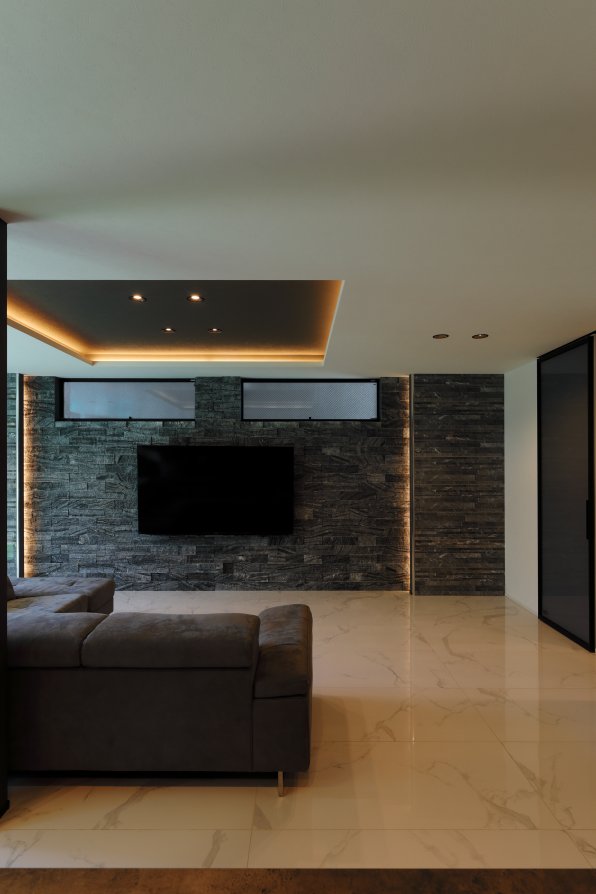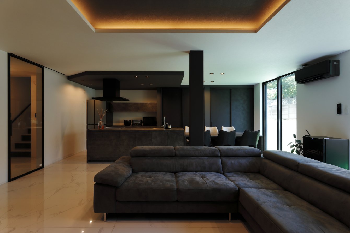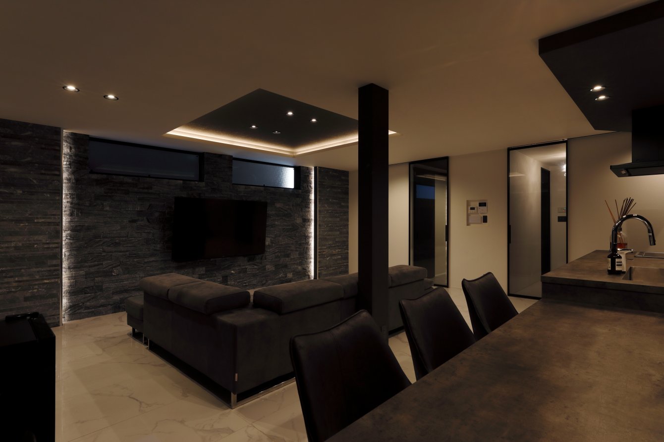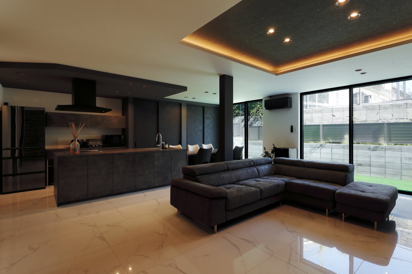 黒を基調とした落ち着いた外観デザイン。貼り分けられた石タイルがひときわ存在感を放つA様のご新居。広いLDKはマーブルのフロアで、壁面には外観と同じく石タイルを取り入れています。効果的に配した間接照明が石の凹凸を美しく照らし出し、日中とはまた違った印象。重厚な素材を用いながら、配色のバランスを取ることで重くなりすぎない空間を叶えています。「気が付けば、いつも家族が揃っている」とおっしゃるリビングはA様のお気に入り。広々としたリビングの向こうにはワンちゃんたちが遊ぶ芝生の庭が広がって、毎日を思う存分楽しむA様ご一家です。