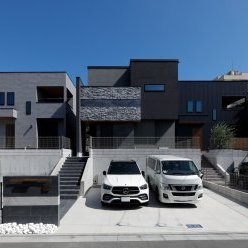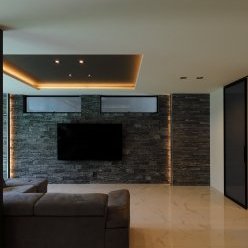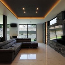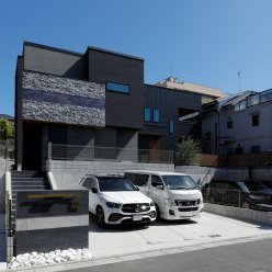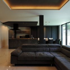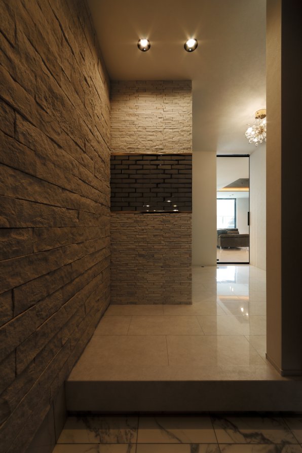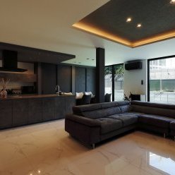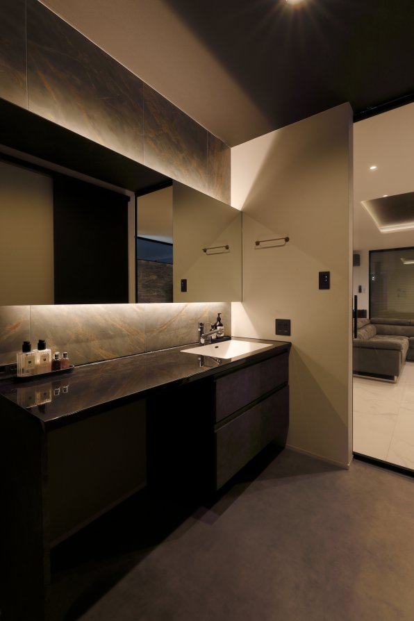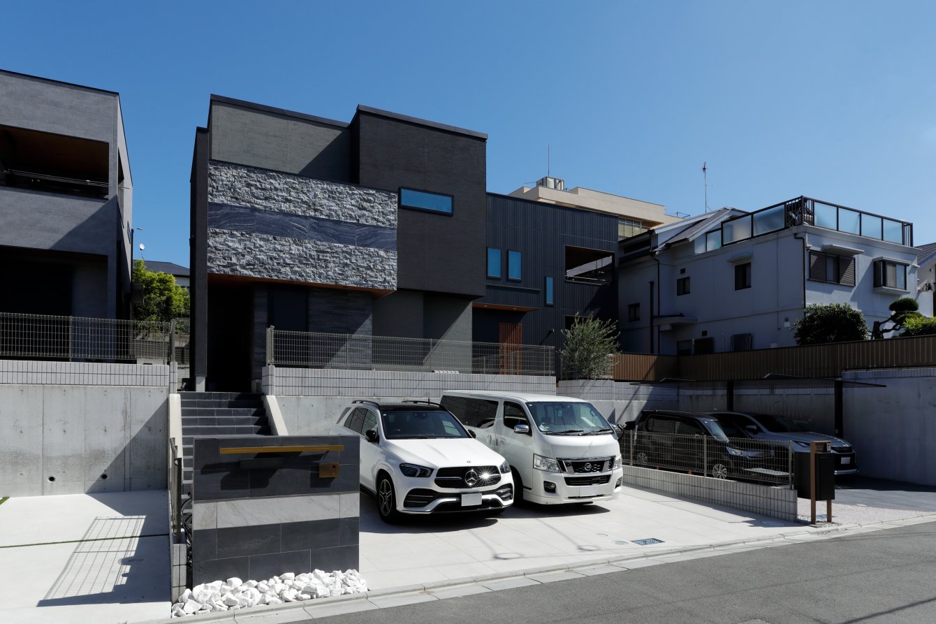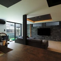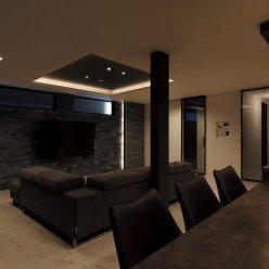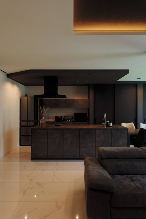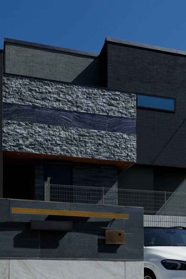 黒を基調とした落ち着いた外観デザイン。貼り分けられた石タイルがひときわ存在感を放つA様のご新居。広いLDKはマーブルのフロアで、壁面には外観と同じく石タイルを取り入れています。効果的に配した間接照明が石の凹凸を美しく照らし出し、日中とはまた違った印象。重厚な素材を用いながら、配色のバランスを取ることで重くなりすぎない空間を叶えています。「気が付けば、いつも家族が揃っている」とおっしゃるリビングはA様のお気に入り。広々としたリビングの向こうにはワンちゃんたちが遊ぶ芝生の庭が広がって、毎日を思う存分楽しむA様ご一家です。