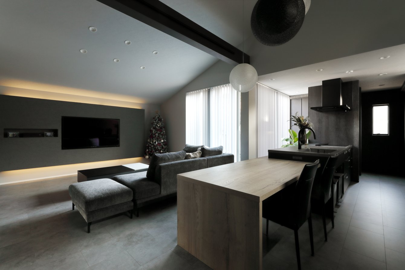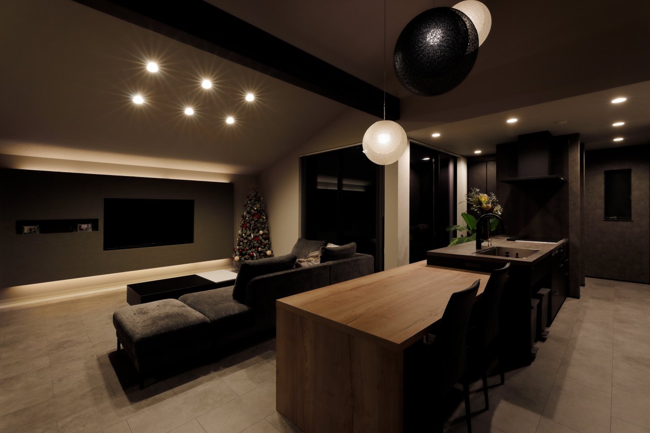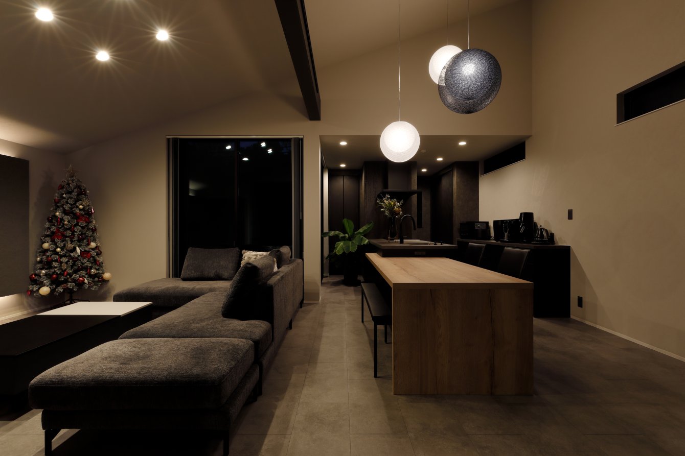 片流れ屋根の大らかなフォルムに、スリットのような図形が重なる外観デザイン。玄関ドアを開けると、モールテック塗りと木で造作された「絵になる階段」が現れます。踊り場の窓から差し込む光に包まれて2階へと進むと、勾配天井の大空間LDK。間接照明が引き立てるTV背面の塗り壁は、2面をアールで繋いで、より一層の広がりを生み出しています。またN様ご夫妻のご要望は、わんちゃんと暮らす家。リビング一角に設けた2匹の愛犬スペースは、地窓から外の景色を楽しめるこの家の一等地です。人も犬ものびのび暮らしつつ、生活感に埋もれないノイズレスなお住まいができました。