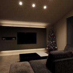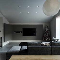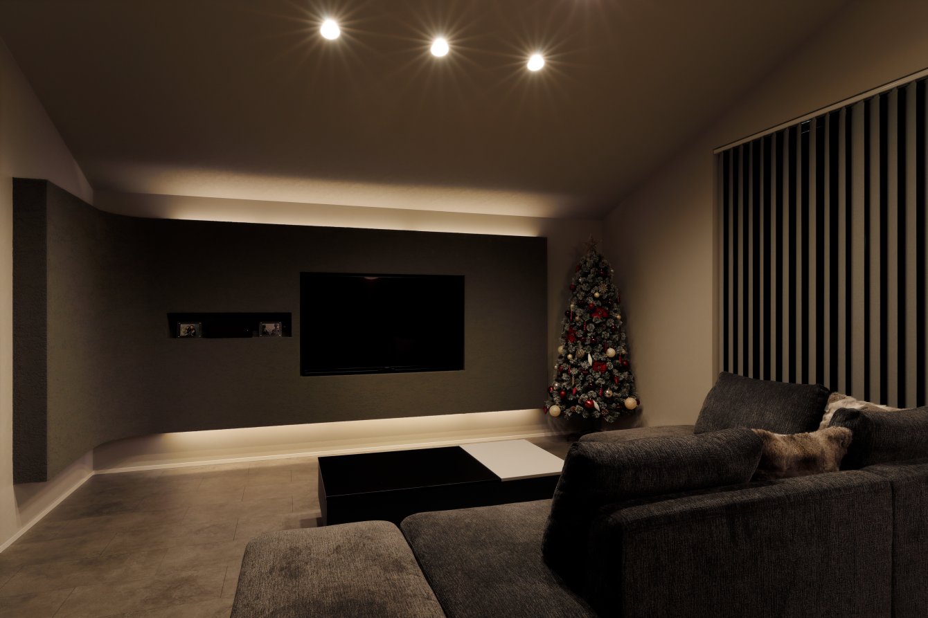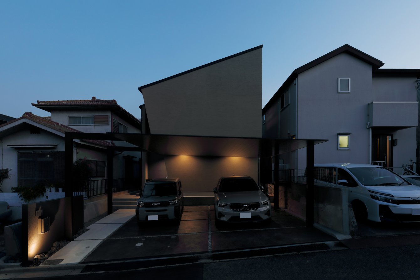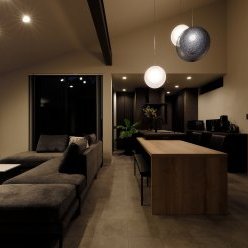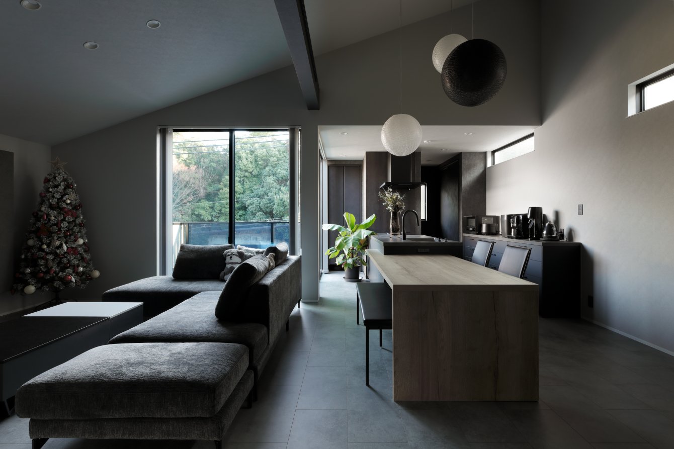 片流れ屋根の大らかなフォルムに、スリットのような図形が重なる外観デザイン。玄関ドアを開けると、モールテック塗りと木で造作された「絵になる階段」が現れます。踊り場の窓から差し込む光に包まれて2階へと進むと、勾配天井の大空間LDK。間接照明が引き立てるTV背面の塗り壁は、2面をアールで繋いで、より一層の広がりを生み出しています。またN様ご夫妻のご要望は、わんちゃんと暮らす家。リビング一角に設けた2匹の愛犬スペースは、地窓から外の景色を楽しめるこの家の一等地です。人も犬ものびのび暮らしつつ、生活感に埋もれないノイズレスなお住まいができました。